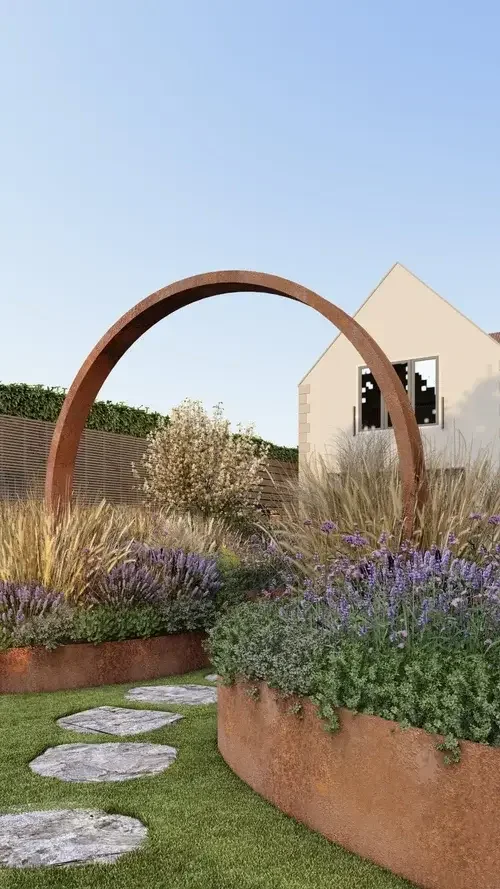 A corten steel moon gate frames the view from the bedroom, guiding the eye toward a light, sculptural focal point that feels intentional yet understated. The steep bank has been carefully softened with upright sleepers, balanced by a magnolia and a simple timber structure that offers a quiet place to pause and reflect.