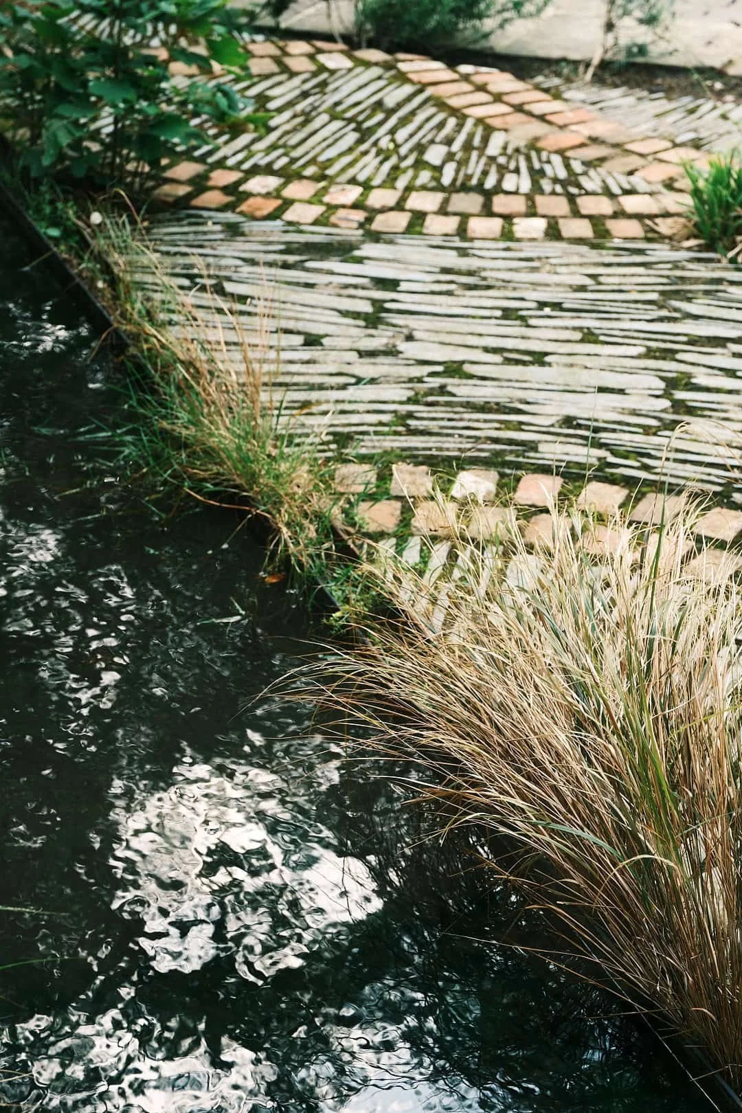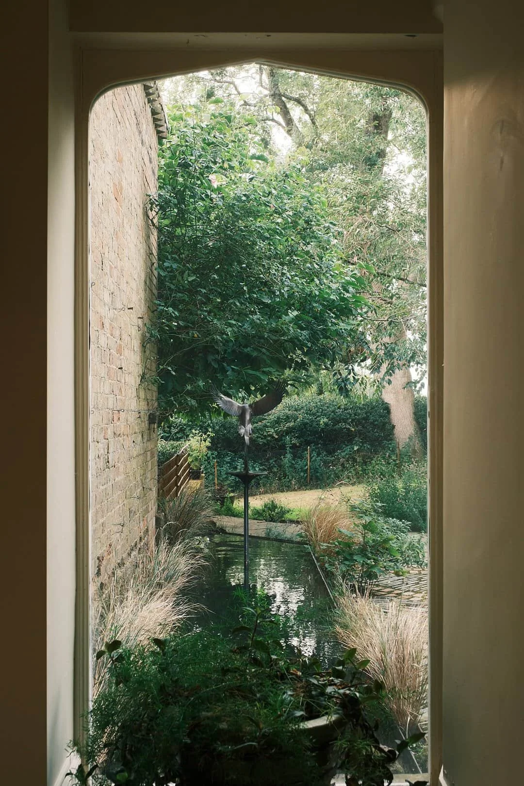 Inspired by a bronze pheasant captured mid-flight, the design introduces movement through water and subtle curves, giving the sculpture both direction and purpose within the landscape. The shallow reflecting pool sits directly in line with the full-height hallway window by the front door, creating an immediate visual connection on arrival and drawing the eye outward into the garden beyond. Ripples are echoed through a restrained palette of Welsh slate and halved red bricks, laid in gentle curves with pockets left open for planting, texture, and natural rewilding over time.